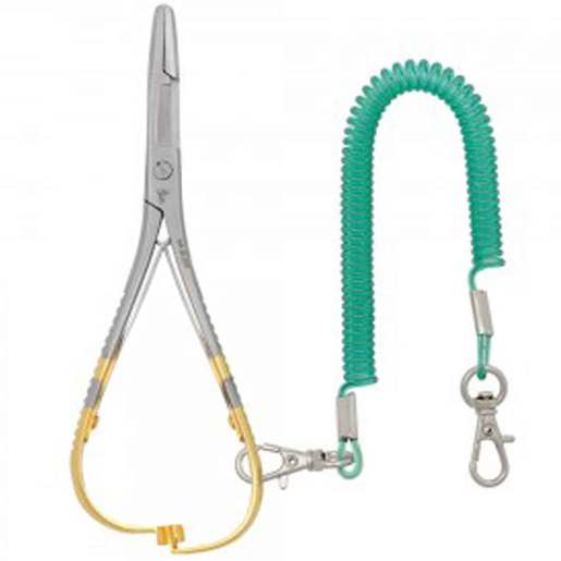 Dr. Slick Mitten Scissor Forcep - Same basic concept as the mitten clamps, but with a serrated scissor mounted behind the jaws. This addition allows for cutting tippet/leader material, trimming flies streamside or opening that pesky bag of jerky. Comes spring-loaded, and with wrist lanyard attached. Half Smooth and Half Cross-Hatch Jaw Structure Available in Straight Jaw Only Pin-In Jaw Wrist Lanyard Included