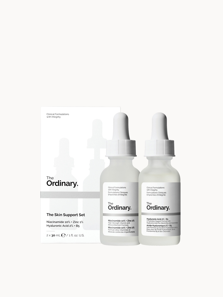 Give skin the support it needs with a concentrated dose of B5, B3 and HA, all in one powerful set. It’s the perfect duo to give skin a boost for smoother, brighter, plumper results with every use. Set Contents: Hyaluronic Acid 2% + B5 30ml The Ordinary’s new Hyaluronic Acid 2% + B5 provides instant hydration to give softer, smoother, healthy-looking skin. The lightweight formula, with added ceramides, replenishes skin’s hydration with all-day results, and helps the skin retain moisture to re-plump dry, dehydrated skin. Hyaluronic Acid 2% + B5 also promotes visible skin suppleness and elasticity, while minimising the appearance of fine dry lines. This formula uses five forms of hyaluronic acid to support hydration. Testing for Hyaluronic Acid 2% + B5 shows: Provides instant plumping hydration that lasts all day* Gives instantly smoother-feeling skin* Promotes supple skin with improved elasticity* Minimises the look of fine dry lines* *Testing on 32 people, 2 times per day for 4 weeks Niacinamide 10% + Zinc 1% 30ml Niacinamide 10% + Zinc 1% is a water-based serum that boosts the look of skin brightness and improves smoothness. It contains a high 10% concentration of Niacinamide (vitamin B3) and zinc PCA. Testing for Niacinamide 10% + Zinc 1% shows: Improves the look of skin radiance and luminosity* *Testing on 35 people, 2 times per day for 8 weeks
