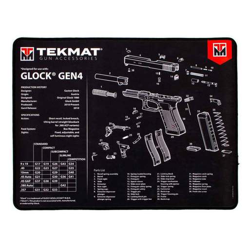 TekMat Glock Gen 4 Ultra Premium Gun Cleaning Mat - TekMat created the original printed cleaning and maintenance mat and with the new Ultra line of Premium TekMats, you get the same quality and durability as the original TekMat but with more space, thicker padding, and a premium stitched edge. The Ultra 20 TekMat is large enough to handle a fully disassembled handgun with room to spare for tools and accessories. The extra thick .25” padding not only provides a premium feel and high level of quality but it offers extra protection from any rough handling or drops while working on your firearm. The ultra soft, oil and water-resistant surface helps protect your firearm from scratches while the diagrams and illustrations help with cleaning, disassembly and are just plain fun to look at. The soft thermoplastic fiber surface ensures your gun doesn't get scratched while the extra thick Cleaning mat measures 15in x 20in and is .25in thick Water-resistant, scratch proof, fade and oil resistant dye-sublimation printing