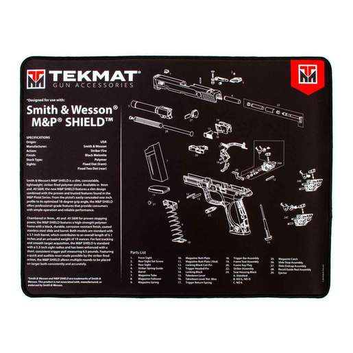 TekMat Smith & Wesson M&P Shield Ultra Premium Gun Cleaning Mat - TekMat created the original printed cleaning and maintenance mat and with the new Ultra line of Premium TekMats, you get the same quality and durability as the original TekMat but with more space, thicker padding, and a premium stitched edge. The Ultra 20 TekMat is large enough to handle a fully disassembled handgun with room to spare for tools and accessories. The extra thick .25” padding not only provides a premium feel and high level of quality but it offers extra protection from any rough handling or drops while working on your firearm. The ultra soft, oil and water-resistant surface helps protect your firearm from scratches while the diagrams and illustrations help with cleaning, disassembly and are just plain fun to look at. Soft thermoplastic fiber surface ensures your gun doesn't get scratched This mat will also keep harmful chemicals, oil and dirt from penetrating down to your desk, bench or work area where you normally clean and work on your firearm Gun cleaning mat measures 15in x 20in and is .25in thick