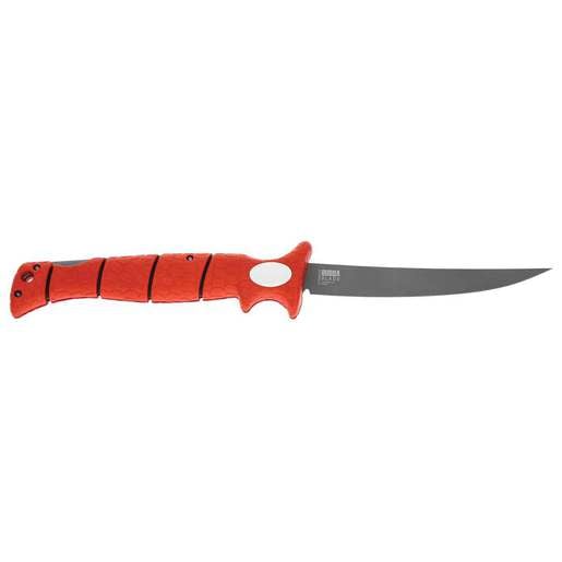 Bubba Tapered Flex Folding Fillet Knife - Red 7in The Bubba Tapered Flex Folding Fillet Knife is a portable version of our most iconic, best selling Bubba 7in tapered flex fillet knife. The Bubba Tapered Flex Folding Fillet Knife is versatile and durable. Made with our signature textured, iconic non-slip grip and titanium-nitride coated stainless steel blade. This non-stick coated blade gives filleting a whole new feel. With its razor-sharp blade, anyone can fillet a fish. If it's your first time filleting a fish or your thousandth time, this knife will make filleting a piece of cake. Its smooth clean cut is ideal for Flounder or Lake Trout and a necessity for all your fishing trips. Comes with a lightweight, nylon sheath. The Bubba Tapered Flex Folding Fishing Knife with Lock-Back Mechanism provides Versatility and Durability The Ti-Nitride coated, rust resistant flexible blade allows for more precise filleting and features an extra sharp tip to make starting your cut a breeze Features safety guards for protection from the blade and spines of fish Non-Slip Grip handle for outstanding grip security providing ultimate knife control with trigger grip for added security Includes lanyard hole and a lightweight nylon sheath for close, hands free carry