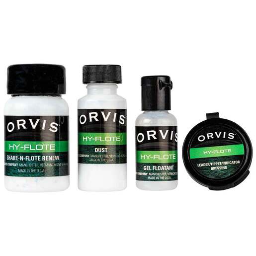 Orvis Complete Hy-Flote Fly Floatant Kit - The Orvis Complete Hy-Flote Fly Floatant Kit has all the fly-fishing floatant you need to keep flies afloat in one handy kit: premium gel, paste, powder, and fly dryer. The gel is temperature-stable. It won't melt in the heat or harden in the cold. The paste gives tippet, leaders, and indicator more buoyancy. Powder keeps flies floating high, has a sparkle attractor and creates a realistic air bubble effect. Shake-N-Flote Renew dries flies fast and reinvigorates them. This fly-fishing floatant system is a great value. Made in USA.