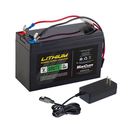 MarCum Lithium 12V 10AH LIFEPO4 Brute Battery and 3 Amp Charger Kit - Leave the weight behind this winter with the MarCum Lithium 12V 10AH LIFEPO4 Brute Battery and 3 Amp Charger. With half the weight and twice the run-time, MarCum's Brute shaves pounds while improving performance. In the past, increased run-time went hand-in-hand with heavier batteries. With the Brute, you get featherweight technology that does not sacrifice performance. Spend more time fishing, and less energy lifting. The MarCum Brute sports a form-factor that provides a direct replacement for any system previously equipped with a 12V7/8/9 AH sealed lead-acid battery. The other advantage that Lithium LiFePO4 offers is a significantly longer lifespan (2,000 full charge cycles), making it a more affordable alternative to lead-acid batteries over its lifetime. The MarCum Brute is also equipped with a BMS circuit that protects the battery from overcharge, over dis-charge, and short circuiting. The performance doesn't stop there, as the MarCum Brute kit is equipped with a multi-stage charger for fast initial charge, reduced-charge near full, and a maintain charge cycle to prevent overcharging. The MarCum Brute kit comes complete with battery, 3 AH charger, and fused charging cable. As an angler, you rely on these power options to fuel your passion for the sport. You can trust MarCum as all of our Lithium and LiFeP04 products are tested and certified to an international quality and safety standard. Lithium LiFePO4 12V10amp battery and 3 AH charger Half the weight, twice the run-time 2 lbs. 11 oz. Complete Lithium Re-Power Kit – Direct replacement to all electronics operated by 12volt 7/8/9 amp hour SLA Sealed Lead Acid batteries Same battery footprint – fits existing electronics and shuttles LiFePO4 is the optimal lithium chemistry for cold-weather performance On-board BMS Circuit for battery management protection Offers 2,000 full charge cycles Multi-stage charge types include fast, reduced-charge, and maintain cycles Safety Tested and Certified to UL 62133 standards Warranted against manufacturer defects for 2,000 charge cycles to 80% full capacity with product registration 128 watt-hours