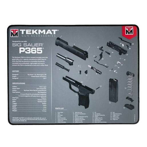 TekMat Sig Sauer P365 Ultra 20 Premium Gun Gleaning Mat - TekMat created the original printed cleaning and maintenance mat and with the new Ultra line of Premium TekMats, you get the same quality and durability as the original TekMat but with more space, thicker padding, and a premium stitched edge. The Ultra 20 TekMat is large enough to handle a fully disassembled handgun with room to spare for tools and accessories. The extra thick .25in padding not only provides a premium feel and high level of quality but it offers extra protection from any rough handling or drops while working on your firearm. The ultra soft, oil and water-resistant surface helps protect your firearm from scratches while the diagrams and illustrations help with cleaning, disassembly and are just plain fun to look at. Features 15in X 20in X .25in Protects Firearm From Scratches MPN TEK-R20-SIGP365