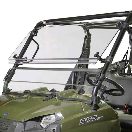 Kolpin UTV Full Tilt Polaris Ranger Mid-Sized 400/500/570 Windshield - Hard-coated 1/4in abrasive-resistant poly-carbonate windshield with scratch resistant finish. This full-tilt UTV/SxS windshield fits Polaris Ranger 400, 500, 570, 800, Crew 500, Crew 570 and EV UTVs. Versatile three-position tilt mechanism permits airflow into the driver compartment if desired Opens 3in or 5-1/2in 1/4in abrasive-resistant poly-carbonate with Scratch Resistant finish Easy to install - NO drilling required. Removable without tools. Extremely durable - injection molded c-clamps Open positions are designed for low-speed riding ONLY Trailerable in closed position ONLY Fits Polaris Ranger Mid-Size models 25 pounds