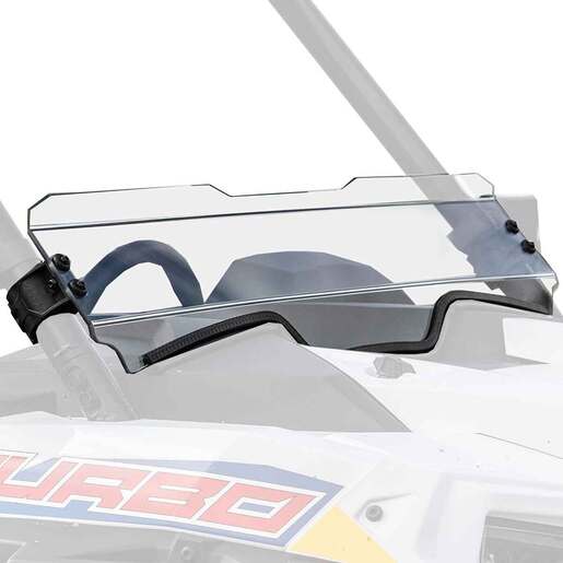 Kolpin UTV Windshield - Half Fixed - Polaris RZR XP and RZR Trail - Half-Fixed UTV/SxS windshield for Polaris RZR XP, 2021+ RZR Trail and 2021 RZR Trail S models. Lip on upper shield deflects air over operator and passenger. Made in the USA. Scratch Resistant - Hardcoated on both sides 1/4in Thick ultra clear Premium Grade Polycarbonate (33% thicker than OEM) Impact resistant - Stronger and lighter than glass Frameless for maximum visibility CNC cut and formed for precision fit Heavy-duty injection molded clamps with stainless steel hardware Co-extruded rubber bulb seal contours vehicle bodywork Compatible with OEM, Kolpin and other Aftermarket Roofs