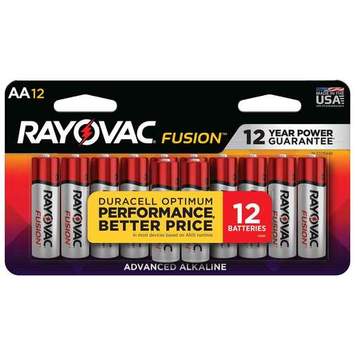 Rayovac Fusion AA Alkaline Batteries - 12 Pack - The most powerful alkaline battery from the #1 value brand in the world, RAYOVAC FUSION AA batteries deliver maximum performance in today’s most power hungry devices. Duracell Optimum performance, better price – in most devices based on ANSI runtime Designed to prevent damaging leaks and tested twice prior to shipment to ensure reliability Ideal for today’s high drain devices, including high-powered toys, video game controllers, wireless headsets and remote-control aircrafts, and more Made in the USA with U.S. & global parts Holds power for 12 years in storage