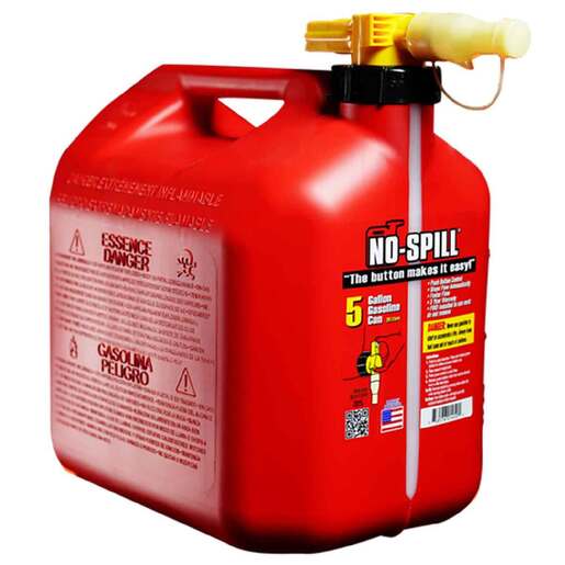 No-Spill ViewStripe Pro 5 Gallon Gas Can - The No-Spill ViewStripe 5 Gallon Gas Pro Can features a unique thumb-controlled fuel spout for easy, controlled pouring and a view-stripe. The design allows for more precise product fueling, reducing spills and overflows for the professional user. High flow rate (up to 3 gal/min), CARB/EPA compliant, and child resistant. Features: Capacity: 5.3 gal Size: 15inL x 10in W x 15n H Weight: 3lbs Material: HDPE Color: Red