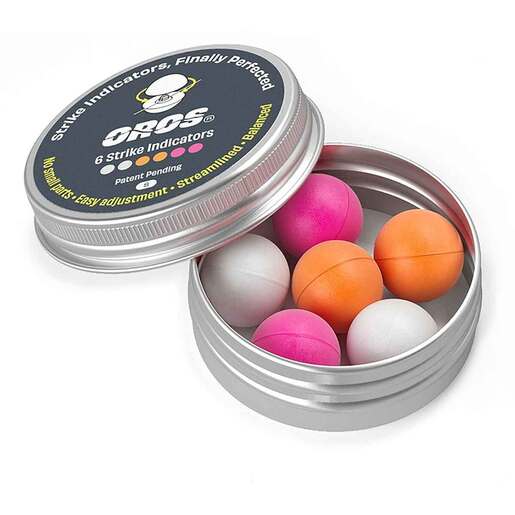 Oros Fly Fishing Screw-on Strike Indicator - 6 Pack - Oros strike indicators eliminate common indicator pain points. There are no small parts to fumble and lose. It's streamlined design is centered on the line for balanced casting. There is no exposed fastening hardware or posts sticking out to create drag or tangle line. The Soft-Lock design advantage Oros strike indicators feature patent pending Soft-Lock technology. The design encloses fastening hardware inside of two molded soft foam hemispheres. When closed, the hardware holds the line, while the foam hemispheres compress creating friction between the two hemispheres that keeps them from disengaging. Over-sized threads make securing it to the line effortless. Wet indicators are easier to use. Oros indicators are easier to grip and tighten down when they are wet. Water on the indicator creates more friction between your skin and the indicator. Water between the two hemispheres reduces friction between the two halves by up to 35%, making it easier to keep line in place. Features and details Does not kink the line Float as much or more weight than the current leading brands. Smooth surface developed to repel water and dirt, and create less drag while casting Made with a Biodegradable additive that accelerates biodegradation with prolonged exposure in natural environments, not in normal use Strike indicator top and bottom colors can be mixed or matched by anglers for optimal visibility Recommended line weights and Sizes Large - 1.0in - 3X or lower Medium - 0.8in - 4X or lower Small - 0.6in - 5X and lower
