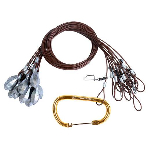 Heyday Texas Rigs Tear Drop 3oz Rig System - 30in - 12 Pack - The 2.5ft 3oz teardrop weight configuration is designed for use in shallow water with minimal current. When every ounce matters, especially for pack-in situations, this is the rig hunters turn to. Ideal uses include flooded fields and timber holes. Includes 12 complete rigs, 1 HangAll Carabiner, and mesh bag. Lifetime PVC Coated Steel Cable Ultra-resistant to memory, tangles, and rust Will not break in cold weather 3/32in diameter DryHand Carabiner Loops Keeps your hands dry Makes for the fastest decoy deployment and retrieval process possible Rig design presents the carabiner loop at the top of the decoy every time NeverLoose Crimps Hydraulically pressed aluminum crimps hold no matter the conditions or how hard you throw them HoldFast Swivel Clips Heavy-duty stainless-steel swivel clips are easy to attach, and will hold in place for as long as you own them. AnchorPoint Weights Cast lead weights offered in a variety of sizes and shapes ensure the perfect configuration for every condition HangAll Carabiner Oversized 5in aluminum carabiner will hold as many decoys as you care to carry, and most anything else needed in the field.