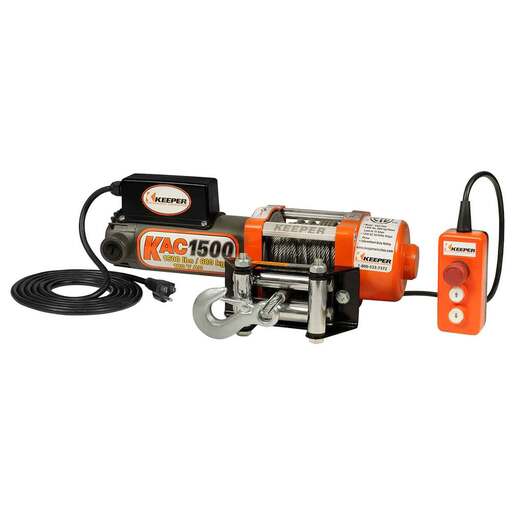 Keeper KAC1500 1,500lb Electric Winch - Keeper KAC1500 Electric Winch is the perfect addition to any garage or workshop, packed with all the features needed for an easy and safe operation. Built for 1,500 lbs. single layer line pull. The electric winch is equipped with an 8 ft. power cord compatible with 110/120V AC 3-prong outlet rated for 15 amps or higher. The 1.2 HP 120V AC motor draws 9.2 amps at full load with quick change brush caps. Installation is easy with the supplied mounting plate, cable tension plate, and mount for the 4-way roller fairlead. Comes with 42 ft. of 3/16 in. galvanized wire rope with a hook and safety latch. To operate, use the handheld pendant which includes power in/out, resettable emergency shut-off switch, thermal motor reset button, and 12 ft. cord for free movement while operating. Features The electric winch has a 3-stage planetary gear box. 262:1 gear ratio All metal gear train. Full-load holding mechanical brake for safety. ETL-certified to meet UL and CSA standards.