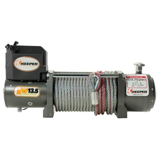 Keeper KW13.5RM 13,500lb Electric Winch - The KW13.5 Winch is a 13,5000 lbs. winch and is the right size for Jeeps, SUVs, and trucks. Built with a 6.6 HP series wound 12v DC motor, 4-way roller fairlead, and full load holding brake to ensure safe operation. The lift and turn free-spool clutch make connections quick and easy to get back on the road. The wireless remote allows the user the freedom to position themselves in the best spot during recovery. The 13,500 lbs. single line pull rating and 265: 1 gear ratio is the perfect match for long-term reliable performance. Features 3/8 in. x 92 ft. galvanized wire rope Three-stage planetary gearbox Wireless remote with two fobs and a 15 ft. wired remote with LED work light Heavy-duty sealed solenoid