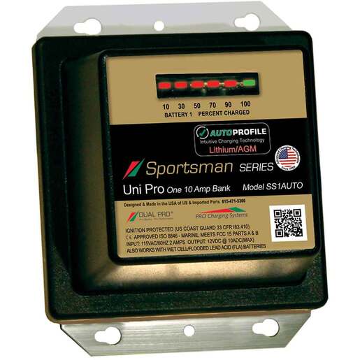 Dual Pro Sportsmans Series AutoProfile Marine Battery Charger - The Sportsman Series of chargers is smaller, lighter and economically affordable. This line of chargers is designed for all types of battery applications. Sportsman chargers have all the safety and reliability features that have made PRO Charging Systems chargers the #1 choice of most boat manufacturers, dealers and over 750,000 customers across the country. Advanced microprocessors and LED readings make the units even easier to use. Auto Profile Features Fully automatic. Completely and safely charges both Lithium and AGM batteries. Algorithms designed and validated with battery manufacturers for a 100% charge. Wake-up feature for Lithium batteries that have turned off due to low voltage protection Auto return to charging feature Quickest charge times in its class Charger Features • Approved for Wet Cell and AGM batteries • Designed for use in fresh and saltwater • DeltaVolt Intuitive Charging Technology • Waterproof, dependable, rugged construction • Independent outputs • Fully automatic / multi-stage charging • Zero spark technology • Battery maintenance mode • On-board diagnostic codes • Temperature compensated • Advanced microprocessor-controlled • LED lights indicate the state of charge • Reverse polarity protected Specs SS1 - (1) 10 Amp Bank Total Output 10 Amps Size: 4.75in x 8in x 6.38in Weight: 5.5lbs Battery System: 12v SS2 - (2) 10 Amp Banks Total Output 20 Amps Size: 4.75in x 8in x 9.25in Weight: 10.9lbs Battery System: 12v, 24v SS3 - (3) 10 Amp Banks Total Output 30 Amps Size: 4.75in x 8in x 11.25in Weight: 15.5lbs Battery System: 12v-36v SS4 - (4) 10 Amp Banks Total Output 40 Amps Size: 4.75in x 8in x 14.25in Weight: 22.2lbs Battery System: 12v-48v