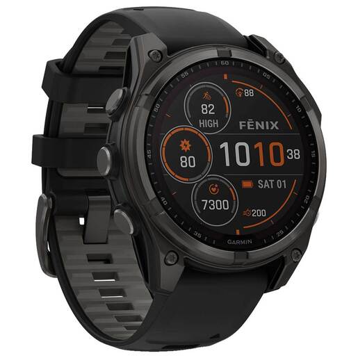 Garmin Fenix 8 Solar GPS Smartwatch - For serious athletes and adventurers who want to push beyond their limits, this premium multisport GPS smartwatch is built to perform with advanced strength training features, dive capability, an internal speaker and mic for voice features, a built-in LED flashlight and up to 28 days of battery life with the Power Sapphire solar charging lens. Features Built to endure, this premium design is dive-rated and features leakproof buttons, a metal sensor guard cover and always-on 1.3in solar charged display with scratch-resistant sapphire lens and titanium bezel. It’s tested to U.S. military standards for thermal, shock and water resistance. Make and take phone calls from your watch when it’s paired to your smartphone. Plus, control watch functions with off-grid voice commands — or use your smartphone’s voice assistant to respond to text messages and more. A true integrated flashlight with variable light intensities and a red safety light gives you greater awareness in the dark, providing convenient illumination when you need it. Strobe mode can even match your running cadence. Elevate your body’s performance with targeted strength training plans and sport-specific workouts for athletes of all types. Begin each day with a customizable morning report offering a summary of health and wellness information. Use the training readiness feature, which looks at a variety of health metrics, to maximize your training efficiency and recovery — to help prevent burnout. A dynamic round-trip routing feature lets you enter how far you want to go — and get suggested routes that will guide you back on time. You can also view terrain contours on TopoActive maps and access preloaded maps for golf courses and ski resorts around the world. Using your VO2 max, training loads and other factors, this feature helps gauge your ability to sustain prolonged effort. Get an estimate of what your pace could be for a 5K, 10K, half-marathon and marathon. Plan race-day strategy with GPS-based pace guidance for a selected course or distance. See real-time information on your current and upcoming climbs on downloaded courses. Get your equivalent running pace at the same effort on flat ground or when ascending. From the moment you wake up, get a readiness score based on your sleep quality3, recovery, training load and more, so you can determine if it’s a good day to go hard — or take it easy. Get insight, and know whether you’re training productively, peaking or strained. Gauge your performance with advanced training metrics such as VO2 max, training load and more. This feature detects sport changes between swim, bike and run in multisport activities — so you can focus on the race and let your watch take care of recording splits. Measure your capability for running uphill, and evaluate your progress over time based on your VO2 max and training history. View your entire week of daily suggested workouts, which adapt after every run or ride. Know how long you need to recover before your next high-effort workout based on your latest training. Prepare for your next race with training tips, personalized daily suggested workouts and more. View crucial running metrics such as cadence, stride length, ground contact time and more. Prepare for your next race, train for a milestone, or simply improve your fitness with Garmin Coach adaptive or prebuilt training plans. Use preloaded activity profiles to get data and insight from your active pursuits. Even track team sport activities such as soccer, football, racquet sports and more. A 40-meter dive rating and leakproof metal buttons let you reach new depths with support for scuba and apnea dive activities. Track your HIIT workouts, including AMRAP, EMOM, Tabata or custom workouts. Follow animated workouts for cardio, strength, yoga and Pilates on the watch screen. Automatically track ascents and descents along with how much time you spend between runs. Measure exercise load when paired with an HRM-Pro Plus chest strap (sold separately). Record waves surfed, maximum speed reached, distance traveled and more. Use Surfline Sessions technology to capture video of waves you ride in front of a Surfline camera. Track the details of your ride with specialized Grit and Flow measurements. Subscribe to Outdoor Maps+ for premium mapping content, such as satellite imagery and enhanced topographic maps, downloaded directly to your watch. Get superior positioning accuracy with multi-band GPS while optimizing battery life. Navigate your next trail with an altimeter, barometer and 3-axis electronic compass. TopoActive maps from around the world keep your explorations on track. Download additional maps via Wi-Fi connectivity. Navigate with a quick glance, and see the distance to the next intersection and the trail name. Get at-a-glance awareness for selected POI checkpoints ahead — such as aid stations — during a race. Create or fi