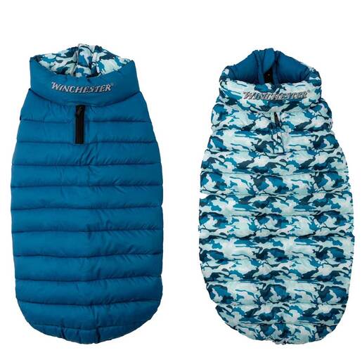 Winchester Reversible Puffy-Vest Dog Vest - Camo Blue - Introducing the Winchester Premium Reversible Puffy-Vest, a versatile and fashionable accessory that keeps your furry friend warm and stylish during outdoor adventures. With its thoughtful design and premium features, this vest offers both functionality and style. Features: Warm and cozy design to provide comfort during colder seasons Reversible feature with a stylish pattern on one side and popular solid colors on the other Durable water-repellant coating Convenient zipper closure designed for comfort and ease of use Small zippered opening on the neck to allow for leash attachment to the dog's collar Machine Washable