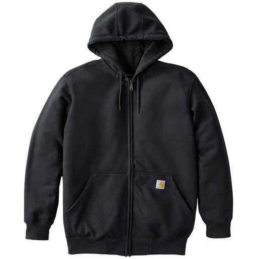 Carhartt Men's Rain Defender Loose Fit Heavyweight Work Jacket - This men's full-zip hoodie is made from durable heavyweight fleece with a water-repellent finish. It has a hidden security pocket inside the handwarmer pocket in the front. Rain Defender durable water repellent finish (DWR) keeps you dry and moving in light rain Attached jersey-lined three- piece hood with drawcord closure Antique-finish brass front zipper Stretchable, spandex- reinforced rib-knit cuffs and wasitband Two front handwarmer pockets with a hidden security pocket inside Carhartt patch sewn on pocket Style: 100614