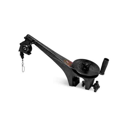 Cannon Mini-Troll Manual Downrigger - A horizontal reel/brake, 100% stainless steel cable and a swivel-head depth counter come standard on this manual downrigger. Compact design perfect for small boats and canoes Swivel-hand depth counter Pre-spooled with 100ft of 120lb test stainless steel cable Horizontal reel/brake Built-in 2-1/2in C-clamp base Saltwater-resistant construction