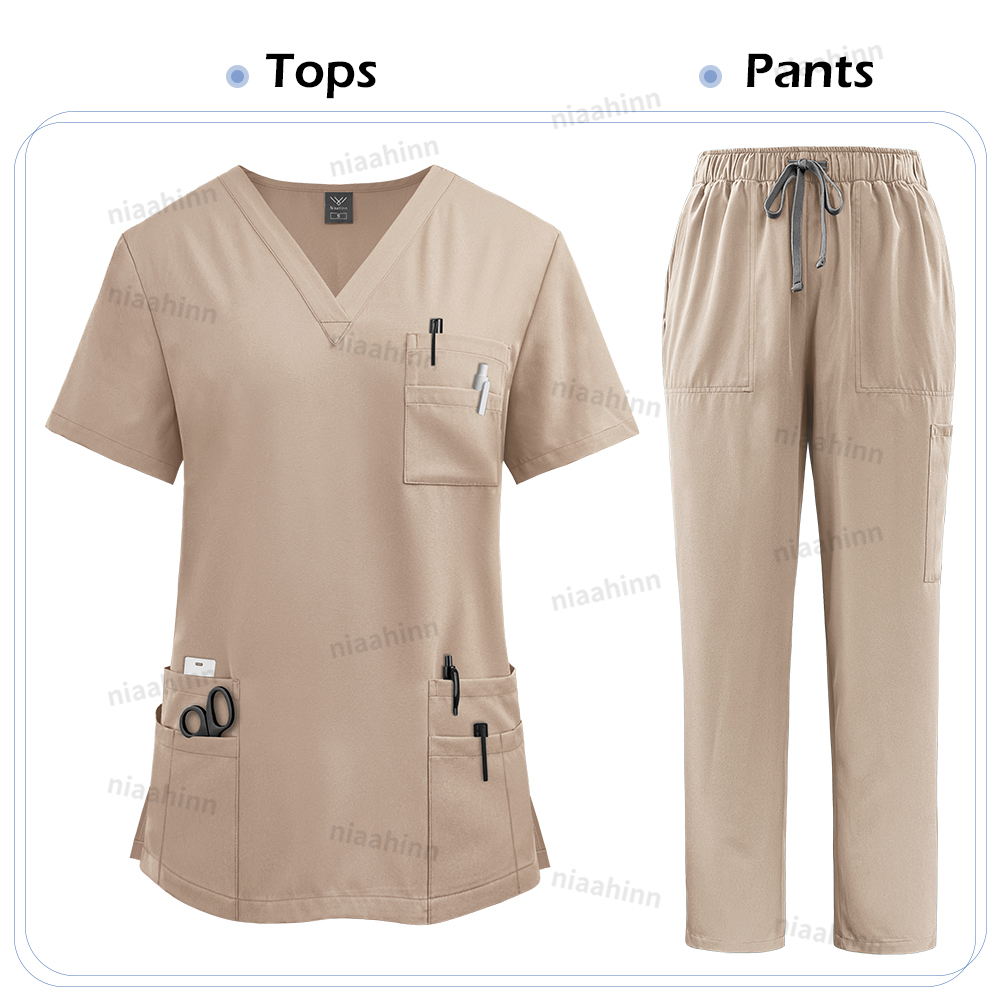 Unisex High Quality Nurse Uniform Set, Medical Clothing For Women With Lab Coat, Tops, And Pants, Nursing Scrubs Suit apricot s