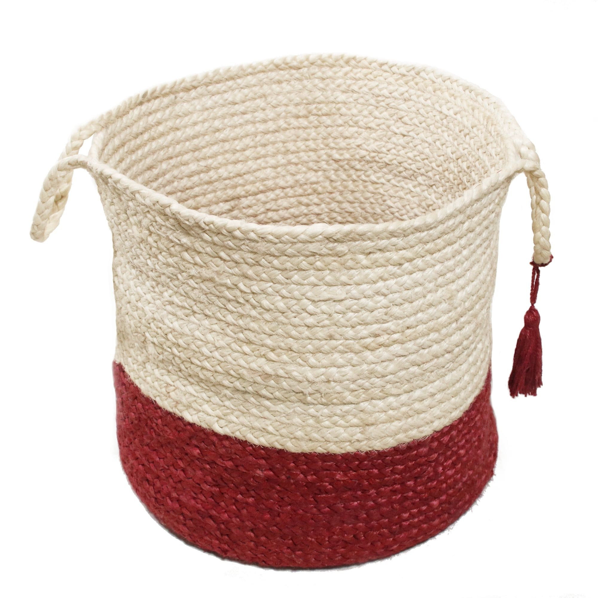 19" Ivory and Red Hand Woven Tasseled Storage Basket with Handles