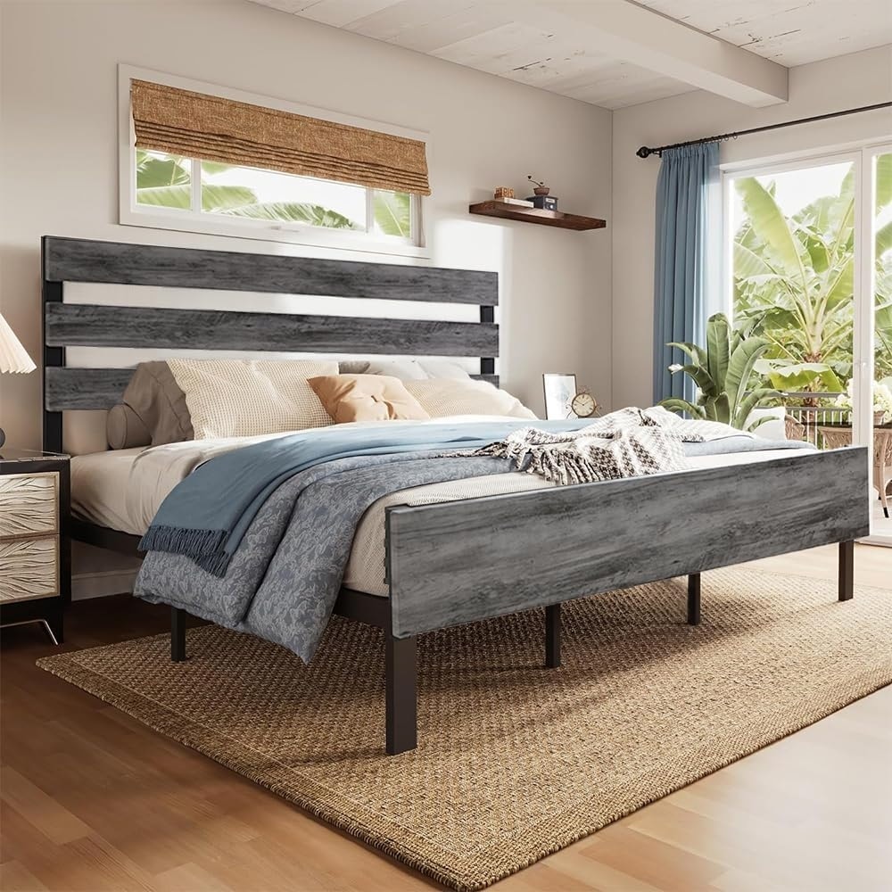 King Size Metal Platform Bed with Wooden Headboard and Footboard, Easy Assembly, Black Gray
