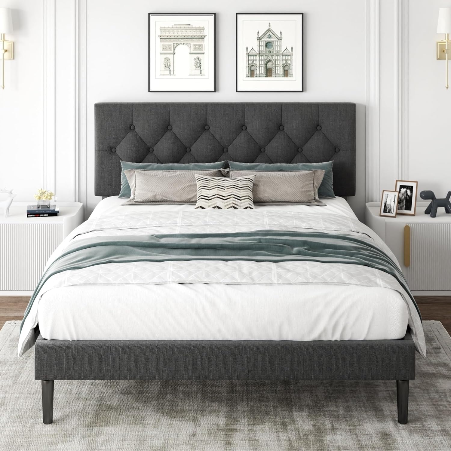 Queen Size Platform Bed with Upholstered Headboard, Button Tufted Design, Easy Assembly, Noise Free