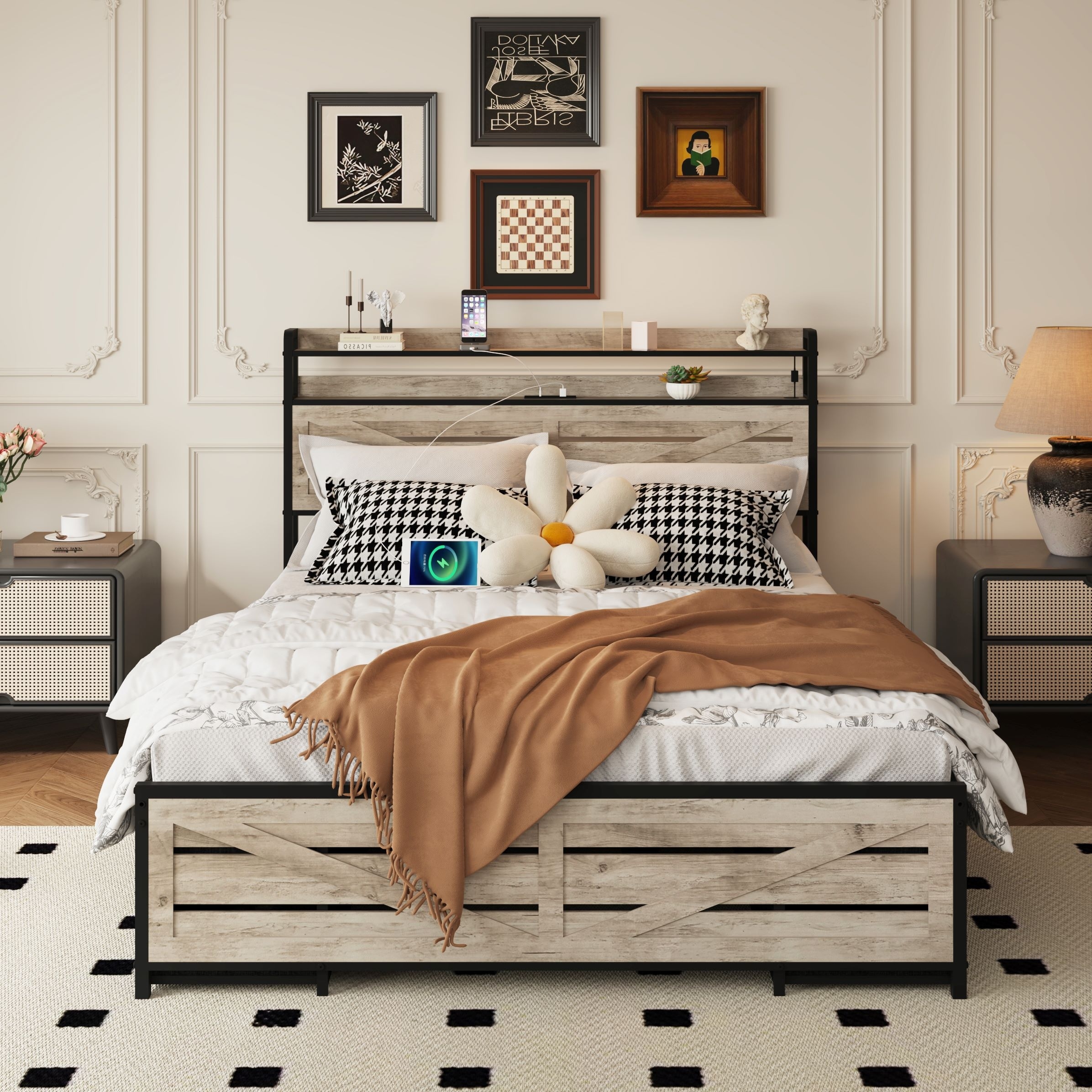 Bed Frame with 4 Storage Drawers and Hidden Storage Headboard Charging Station