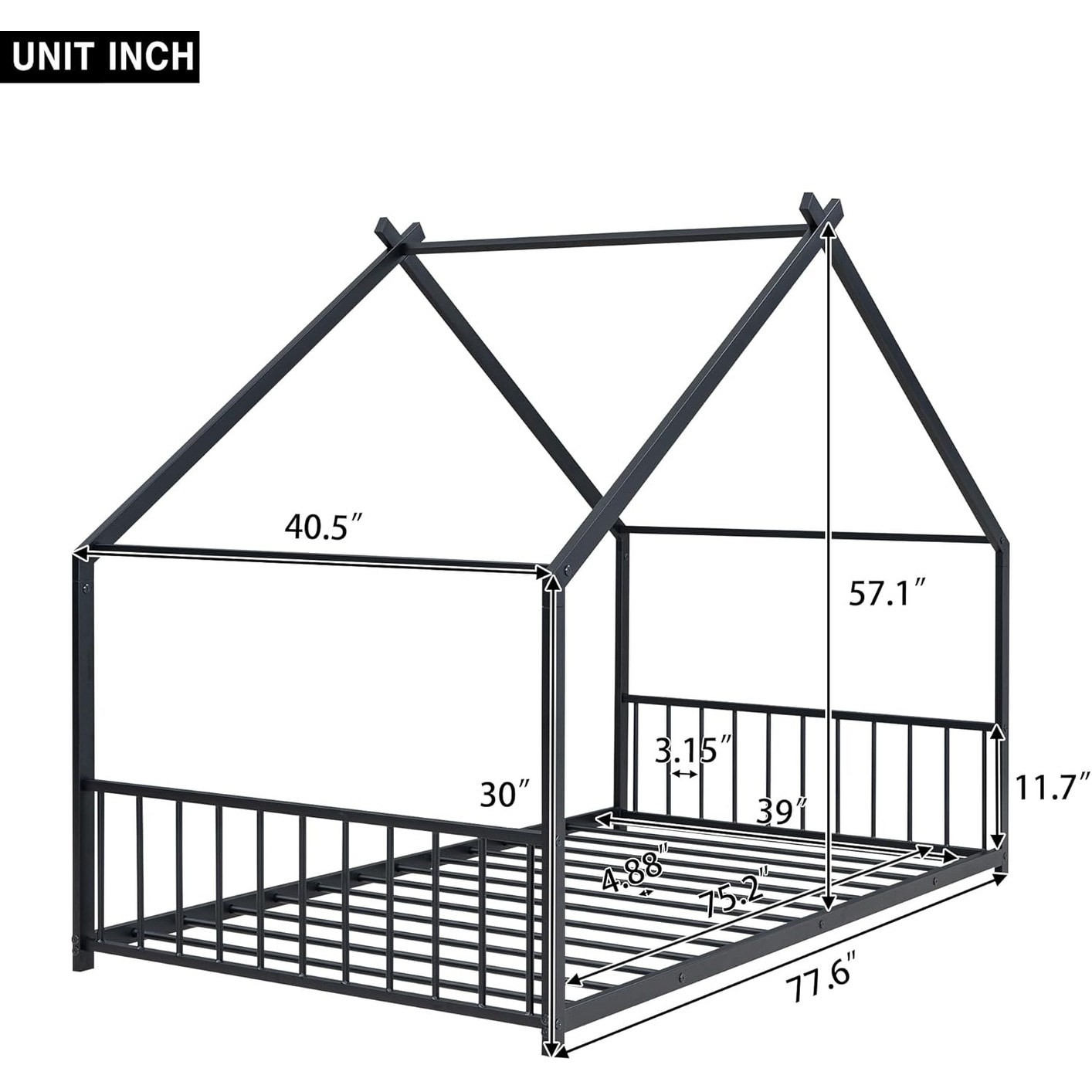 Twin Size Metal Floor Bed with Slats and Roof for Kids, Black