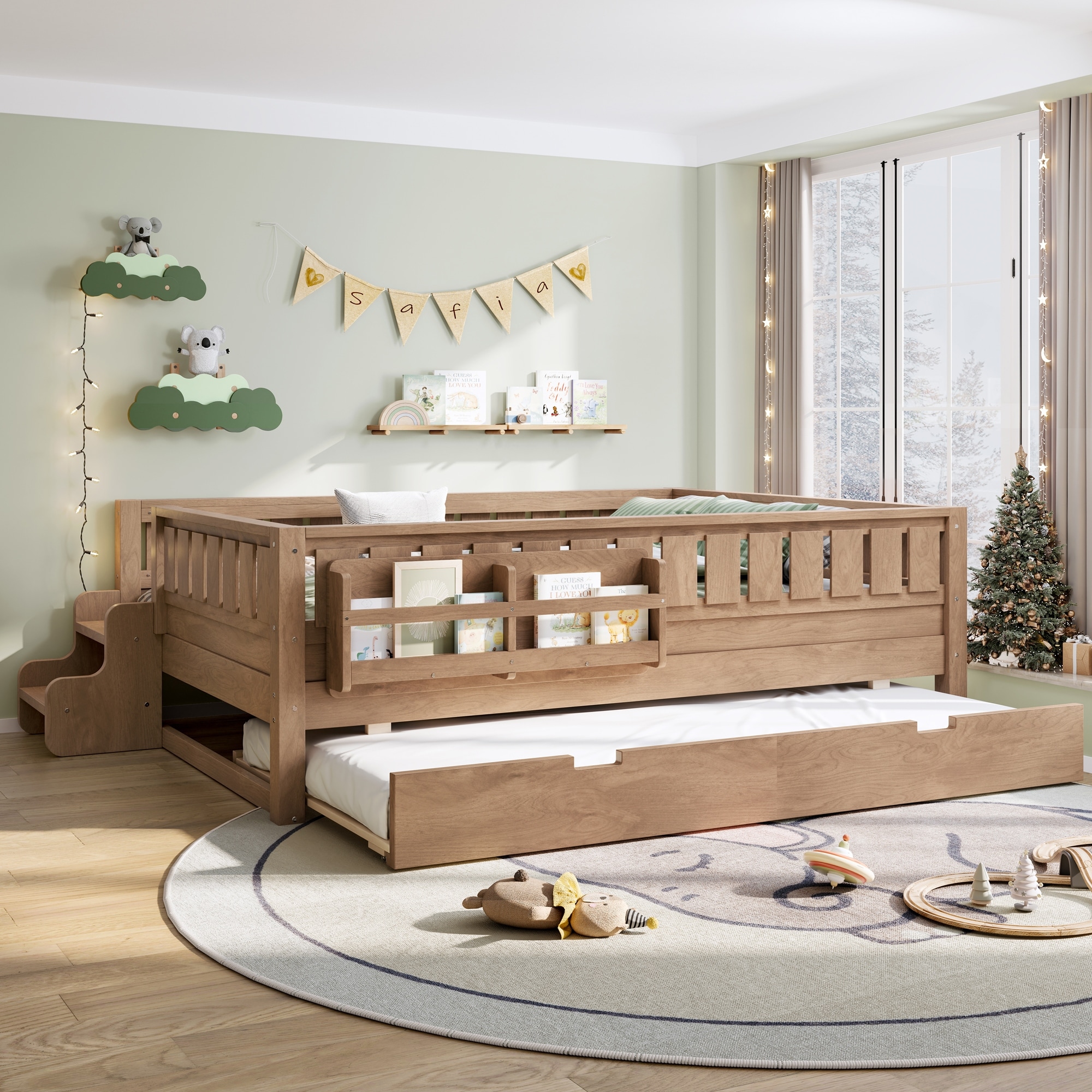 Full with built-in bookshelves and small staircase, high-quality safety rails, and Trundle,Natural