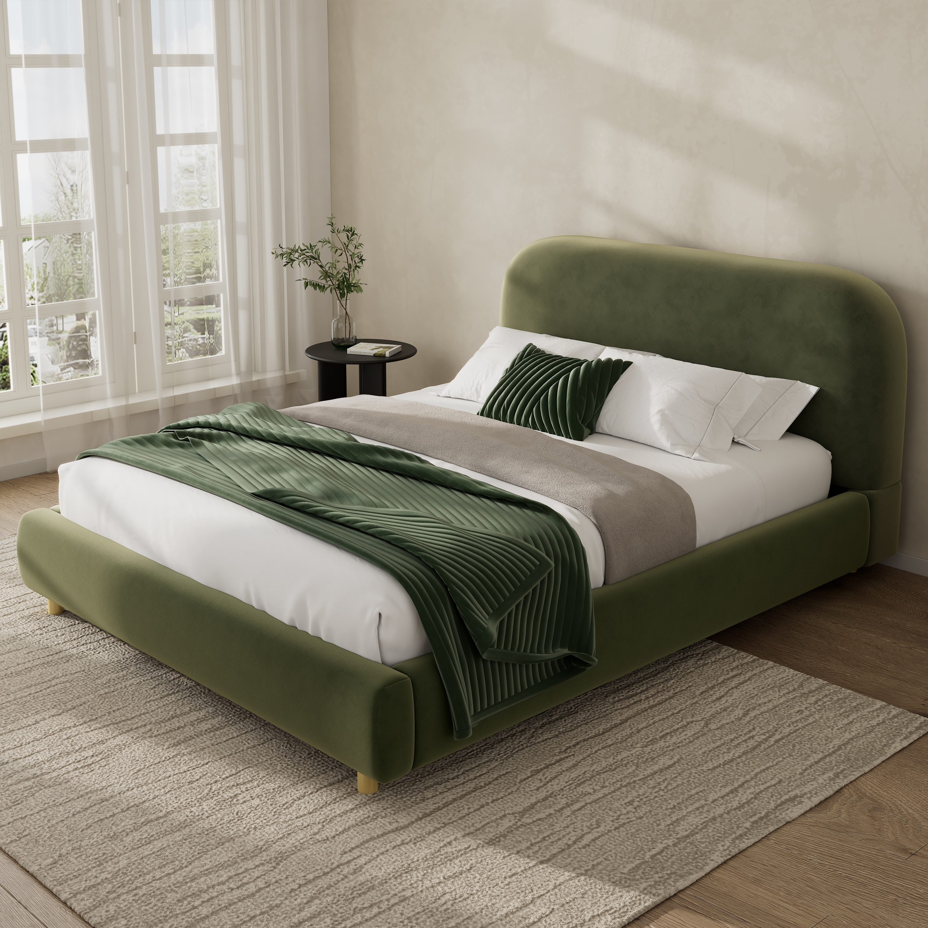Queen Size Platform Bed with Velvet Fabric, Upholstered Bed with Curve Design Thick Headboard, Olive Green