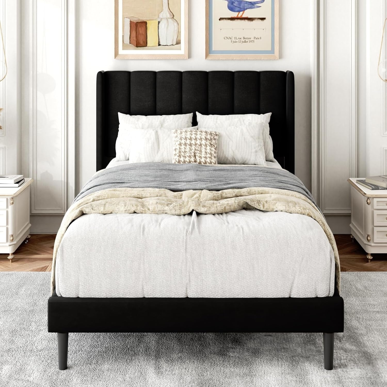 Twin Size Upholstered Wingback Platform Bed Frame with Wooden Slats, Easy Assembly, Black