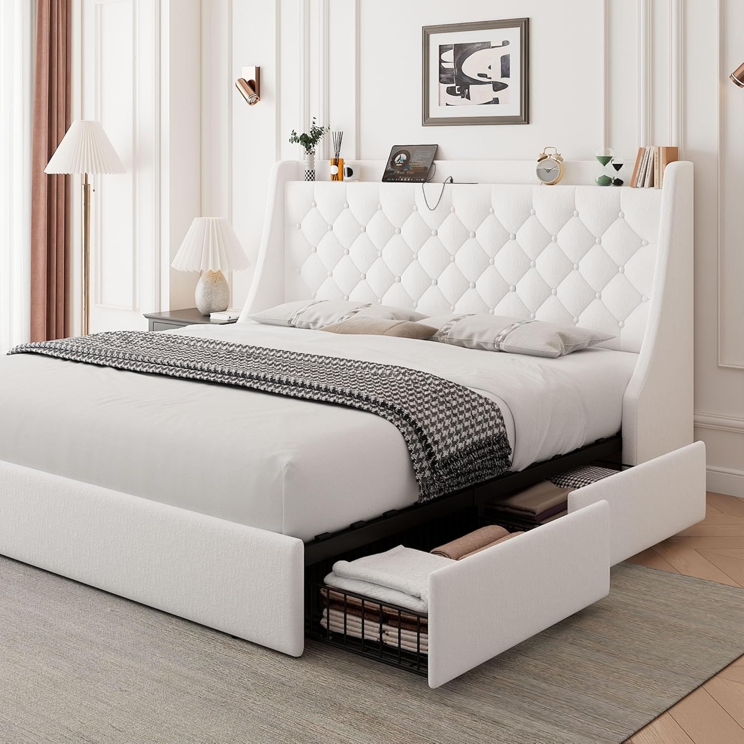 Full Size Upholstered Bed Frame with Storage Drawers, Charging Station, Wingback Headboard, Easy Assembly, White
