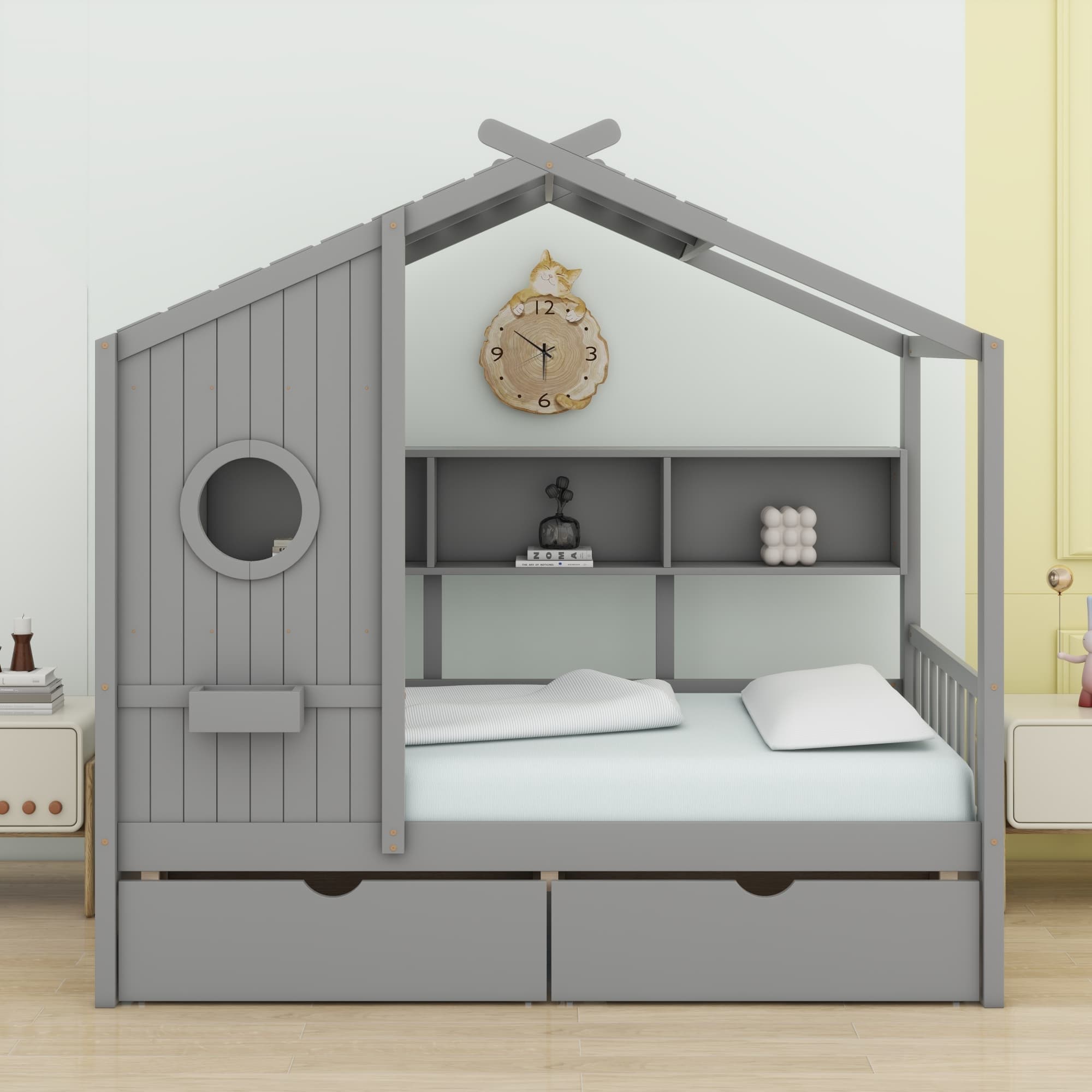 Full/Queen Size Bed Frame with Vintage Style Headboard & Footboard, Wooden Platform Bed with Wooden Slats Support