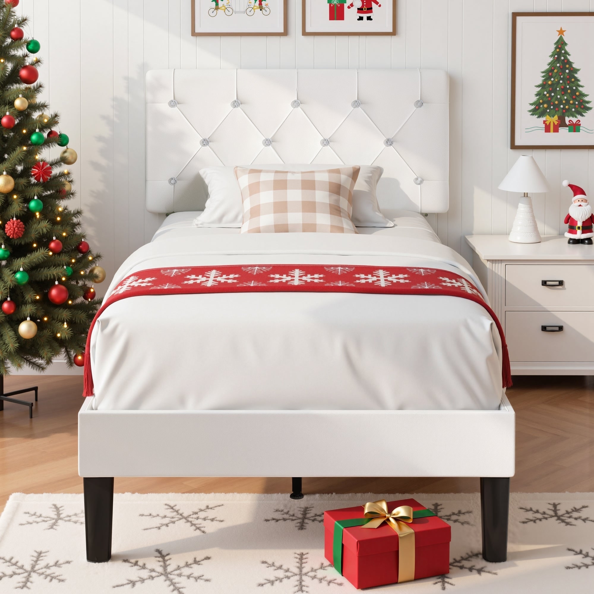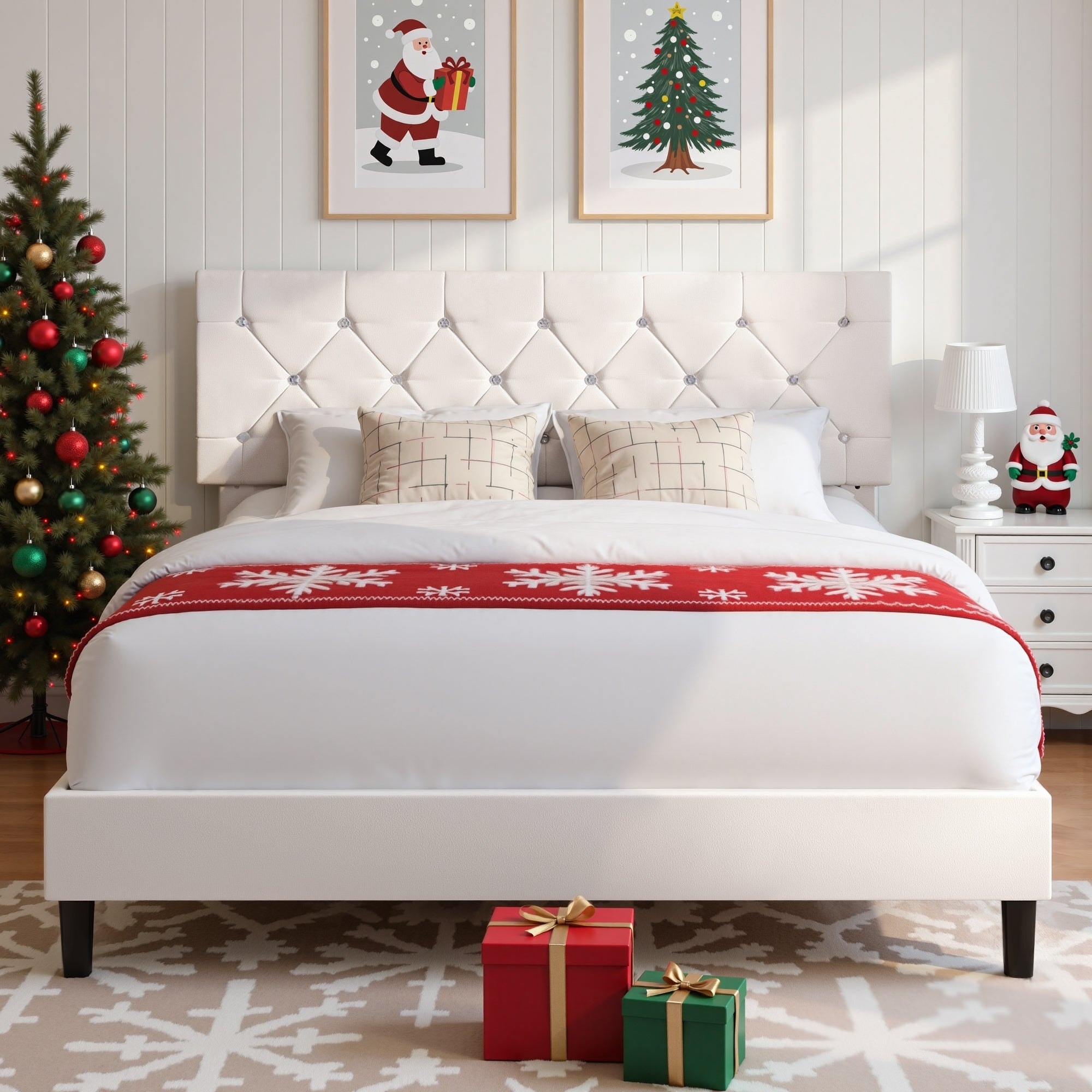 White Modern Velvet Upholstered Platform Bed Frame with Diamond Headboard Heavy Duty & No Box Spring Needed Bed Frame