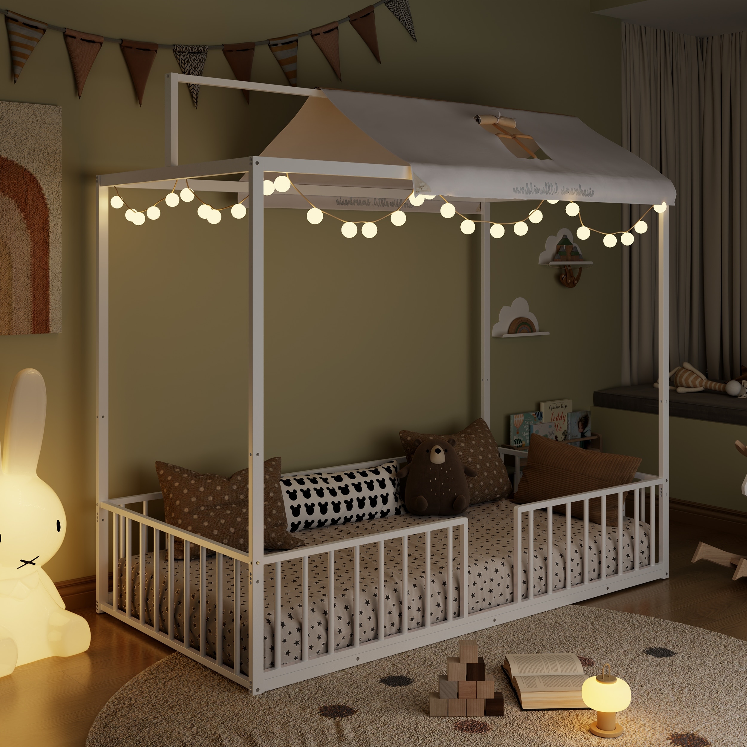 Full Size Metal House Bed Frame for Kids with Roof Design, No Box Spring Needed