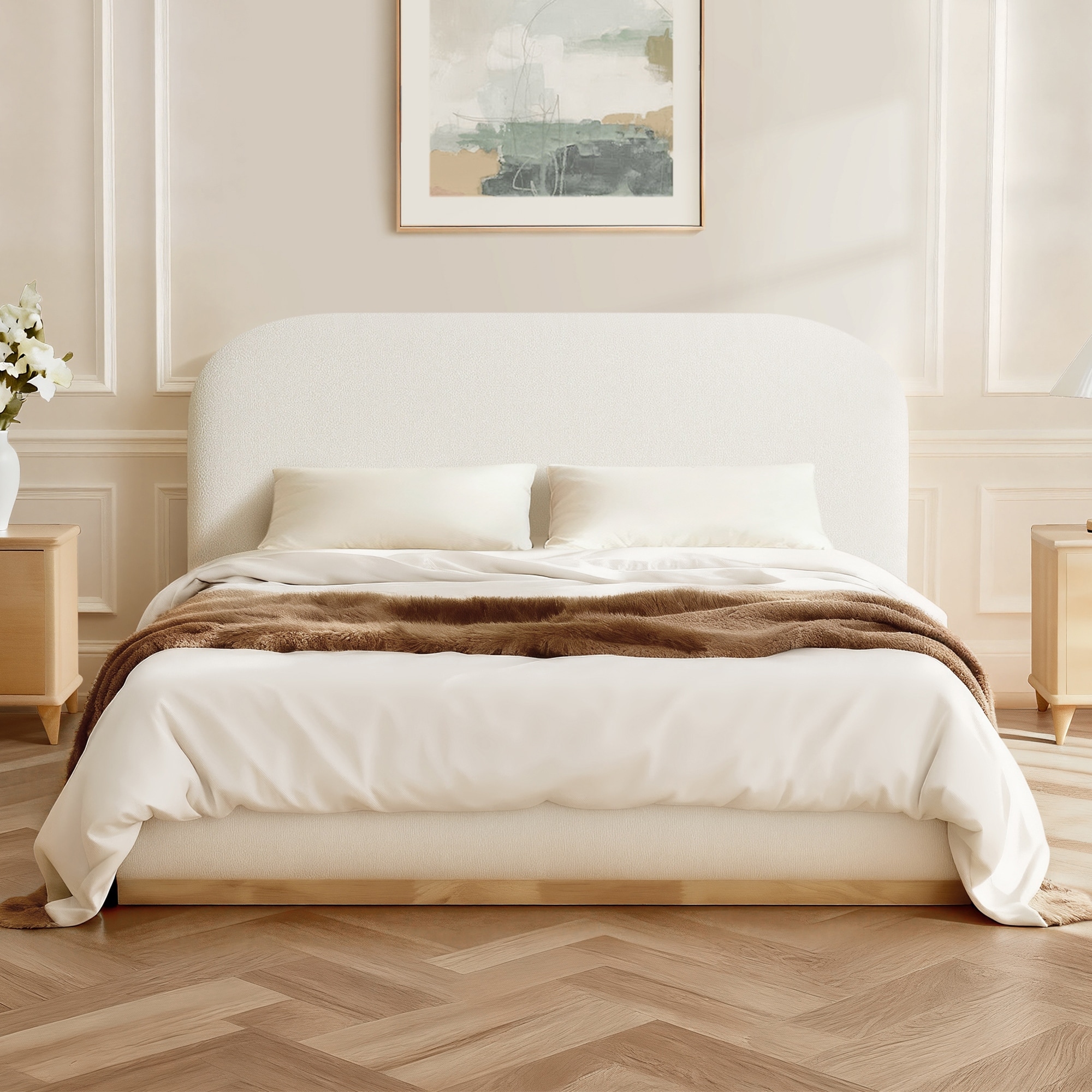 Modern Boucle Upholstered Platform Bed with Solid Wood Frame