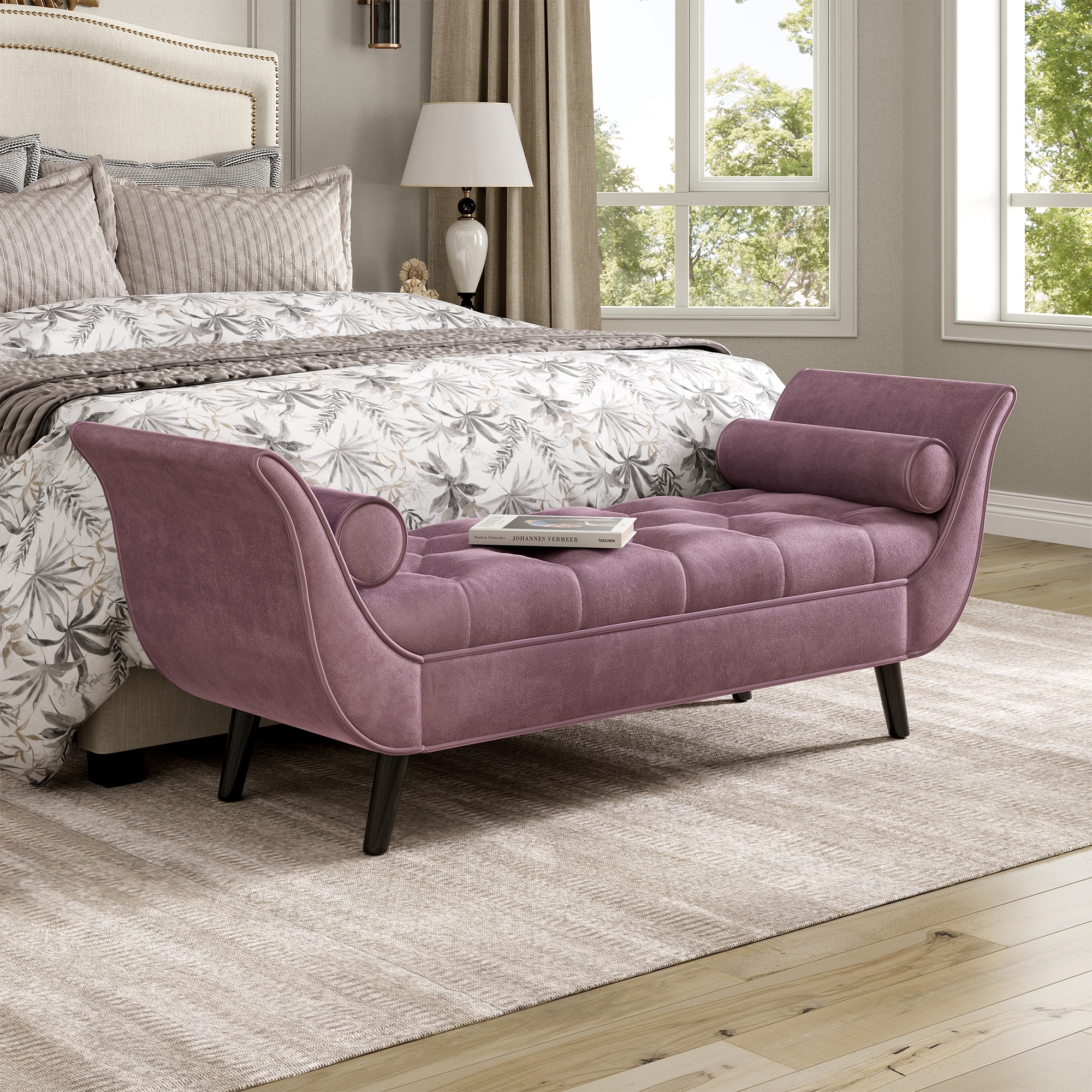 Upholstered Velvet Bench with 2 Pillows, Upholstered Button Tufted Ottoman, Footstool with Rolled Arms and Solid Wood Legs