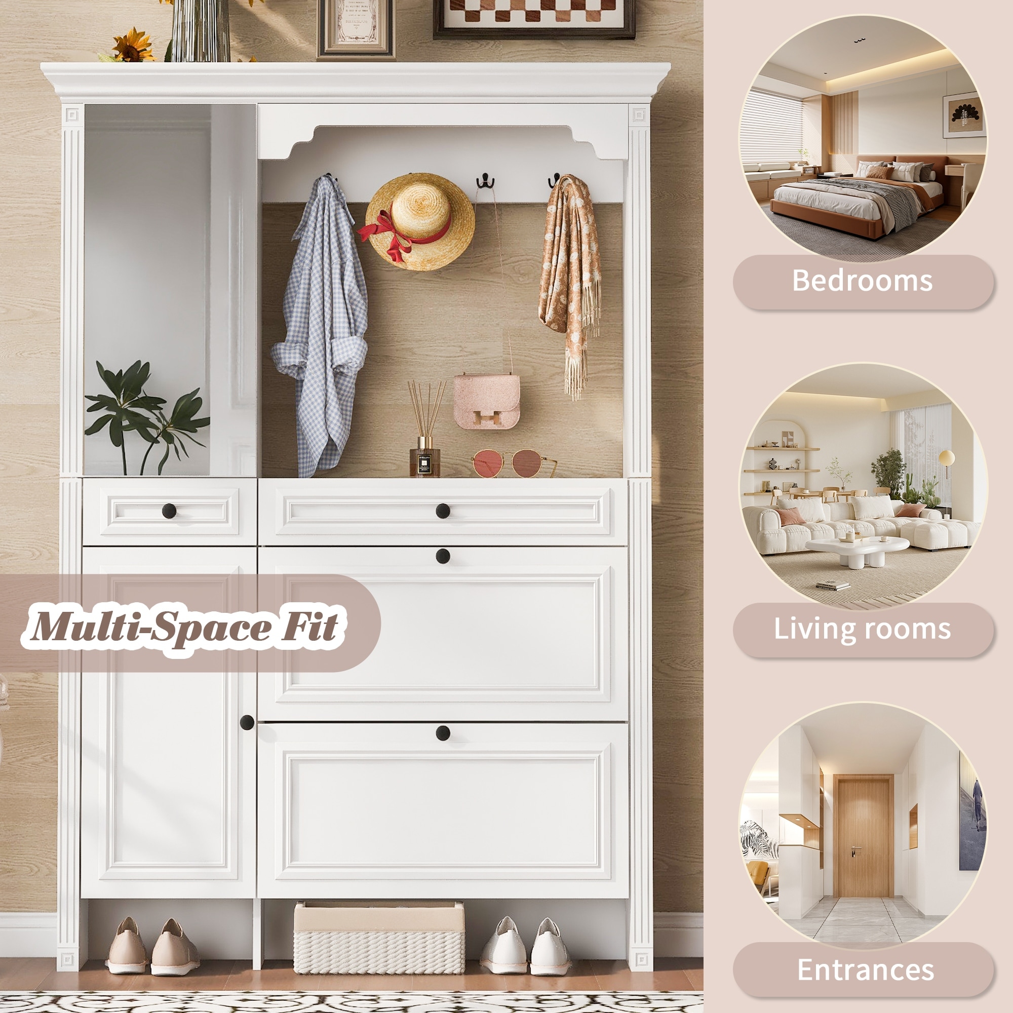 54.7'' Hall Tree with Flip Bucket Shoe Cabinet, Mirrored Cabinet Door, Coat Hanger & Drawers, Entryway Coat Rack, White