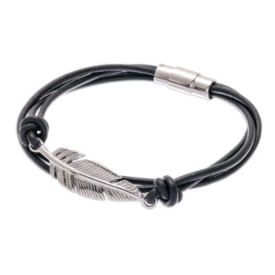 Stunning Feather in Black,'Stainless Steel and Black Leather Feather Pendant Bracelet'