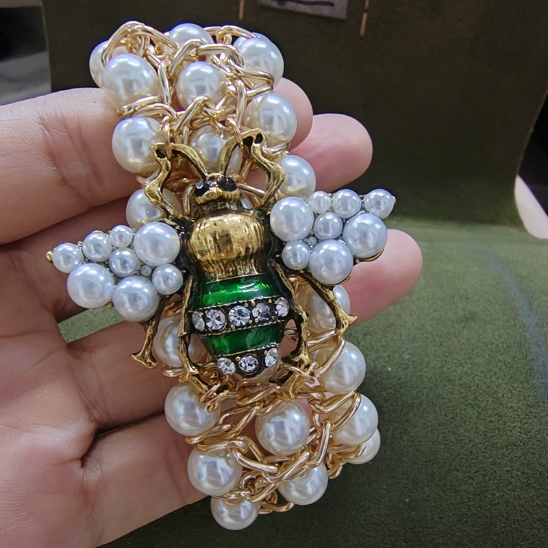 Luxury Handmade Elastic Pearl Bee Bangle Bracelet For Women, Designer Party Gift Jewelry green Bracelet
