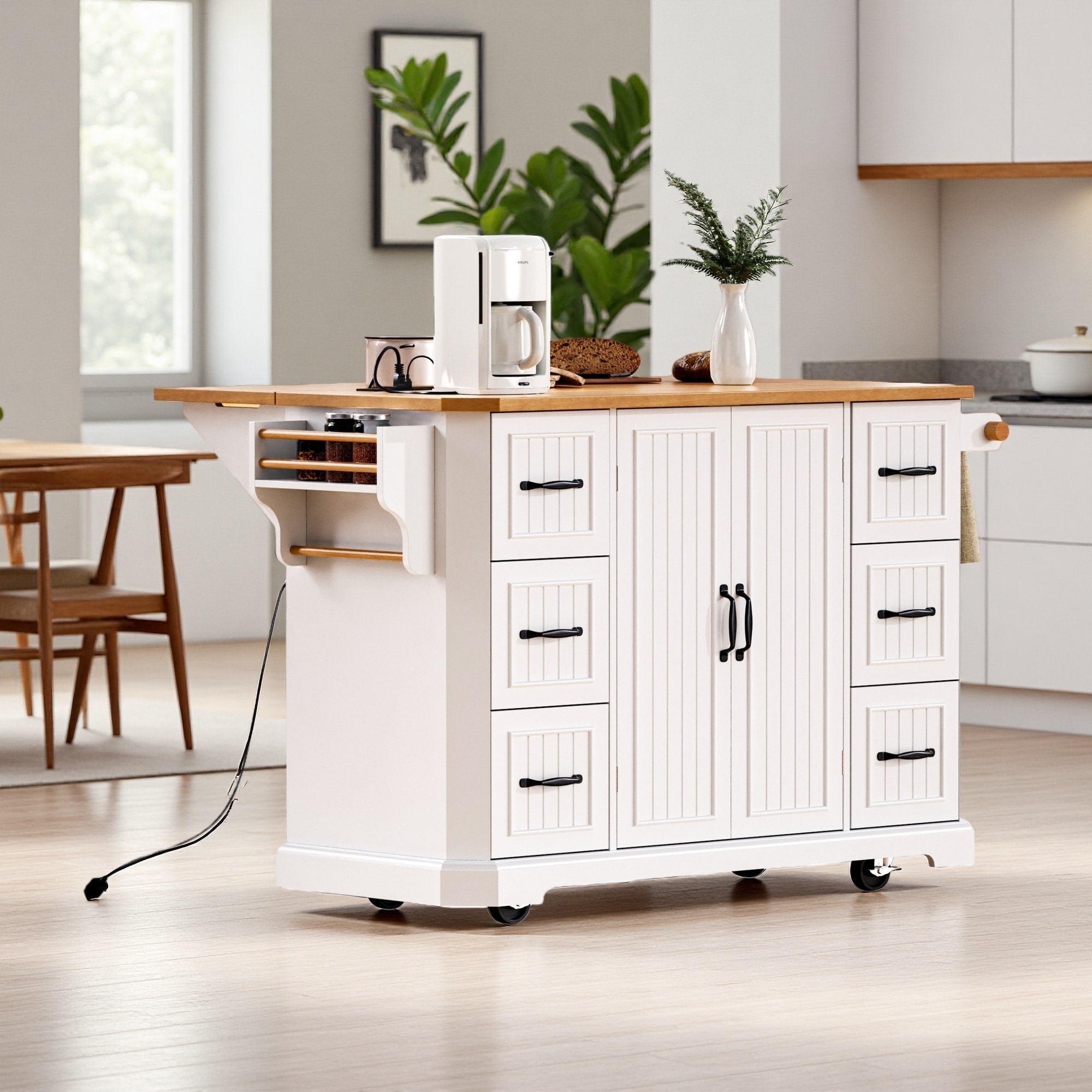 Kitchen Cart with Rubber wood Drop-Leaf Countertop