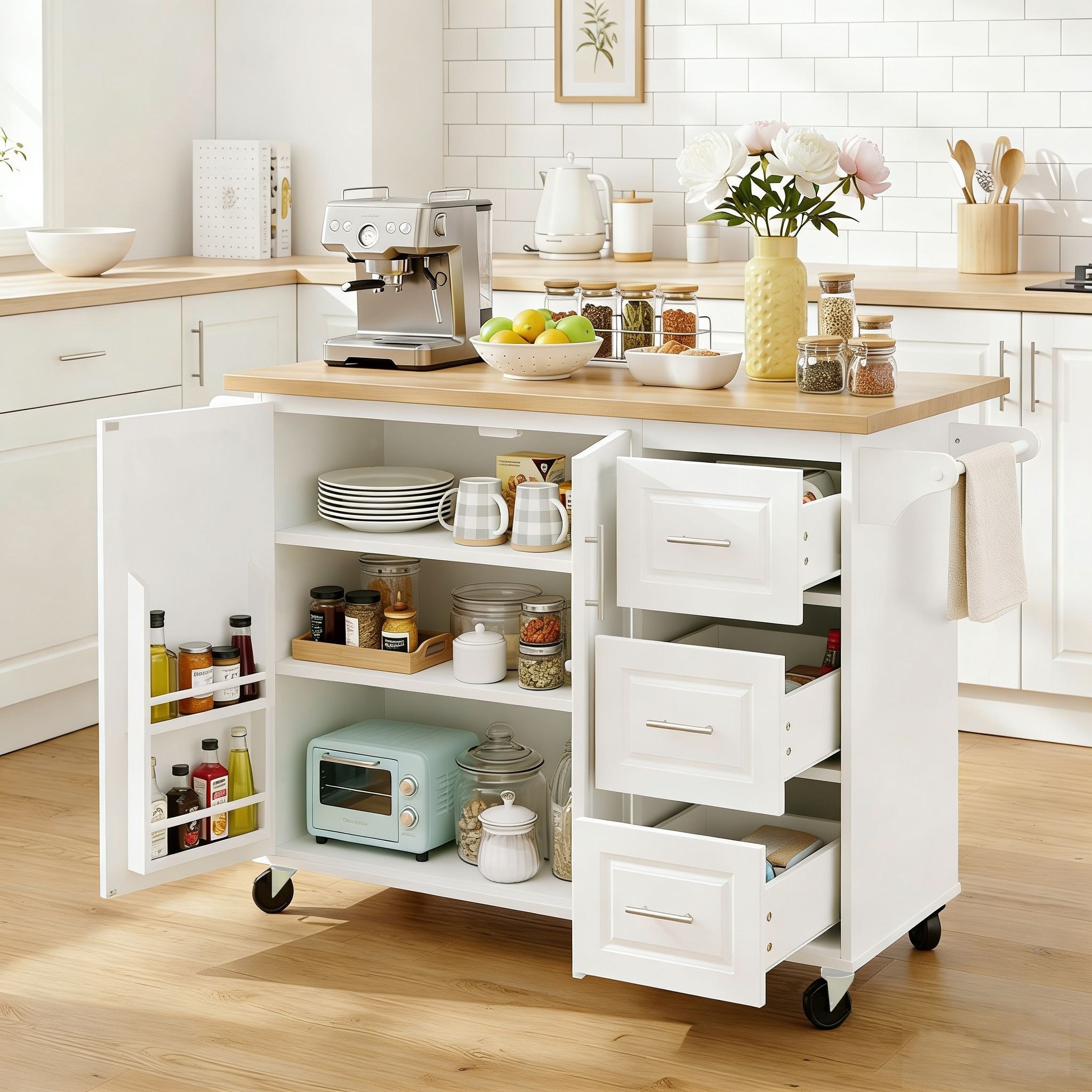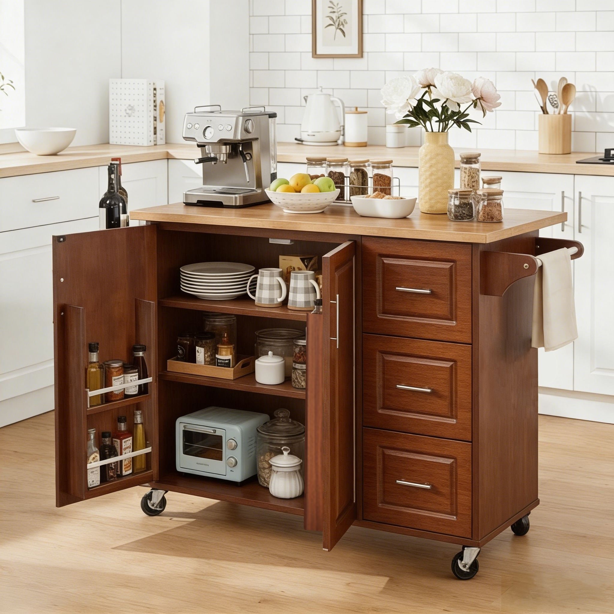 Classic Wooden Kitchen Island Cart with 2 Drawers, 2 Cabinets, a Towel Rack and a Spice Rack