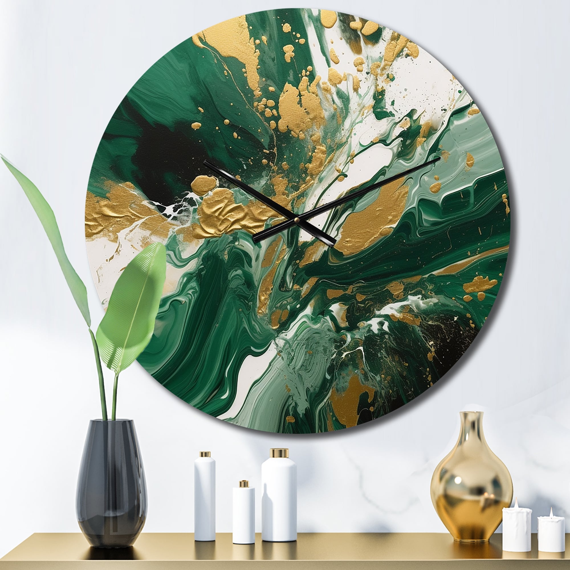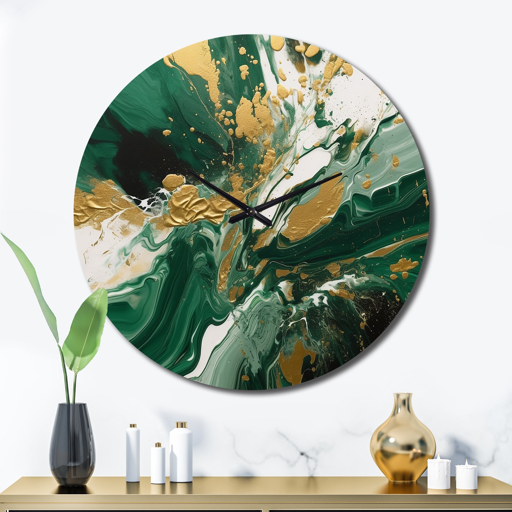 Designart "Green and Gold Liquid Magic I" Abstract Oversized Wall Clock