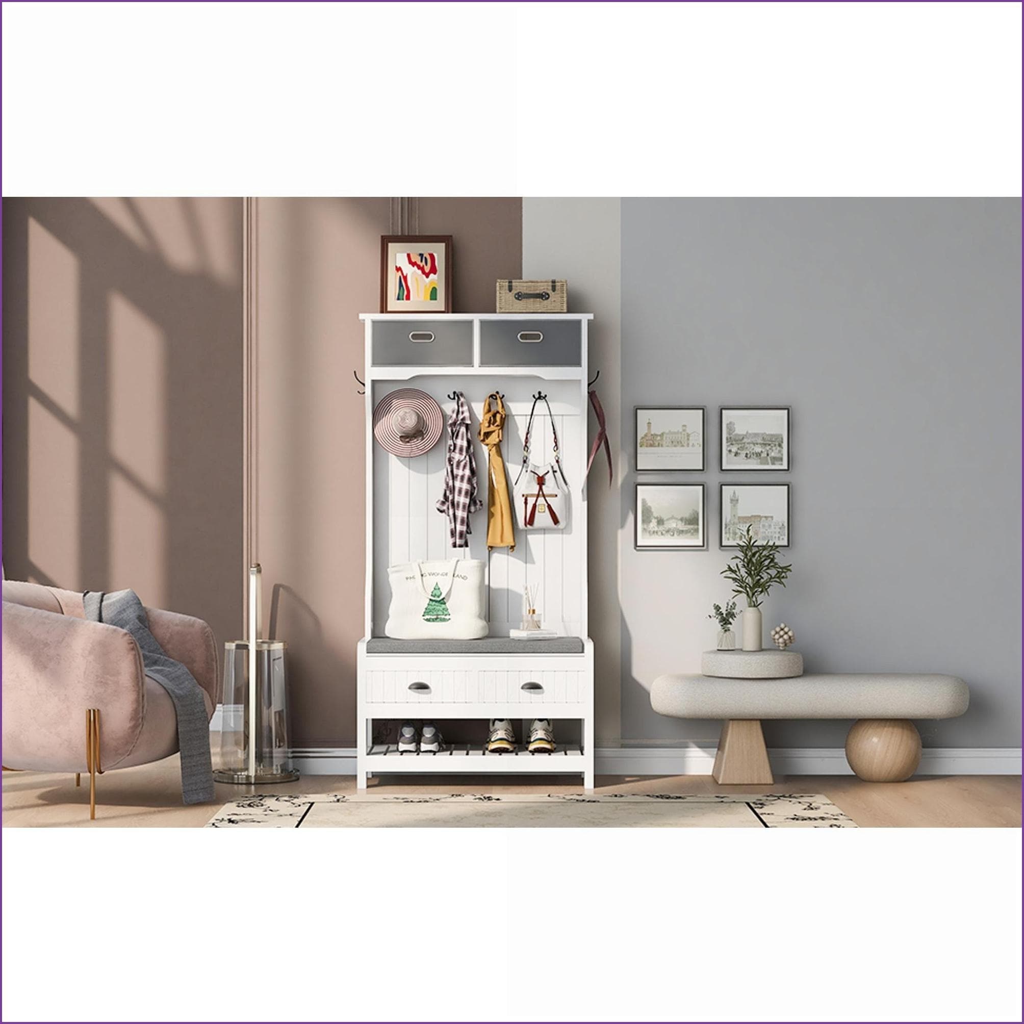 Coat Racks 3-in-1 Hall Tree with 6 Hooks, Storage Bench, 69-Inch, White, MDF