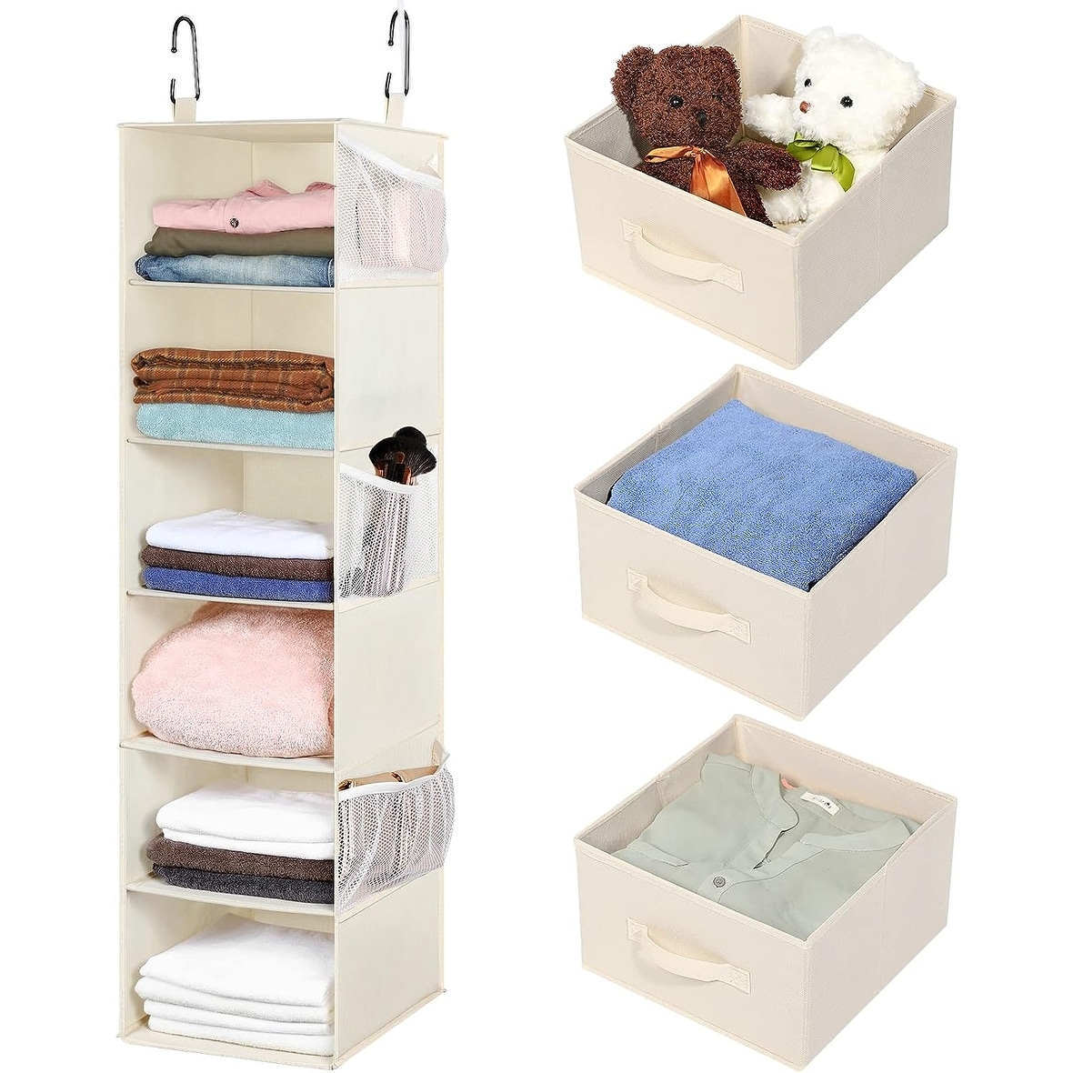 Hanging Closet Organizer - 6-Shelf Hanging Storage Shelves with 3 Drawers & Side Pocket