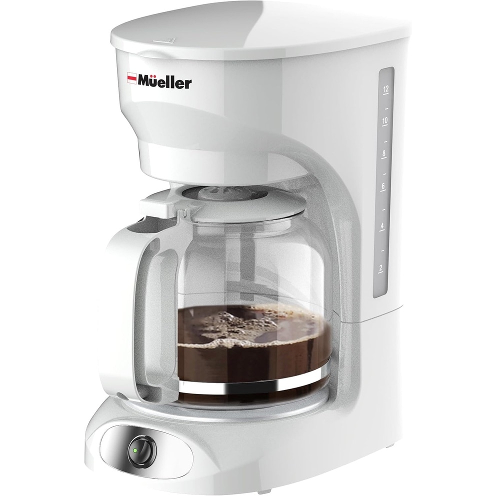 12-Cup White Coffee Maker with Borosilicate Carafe, Auto-Off, Reusable Filter, Clear Water Window