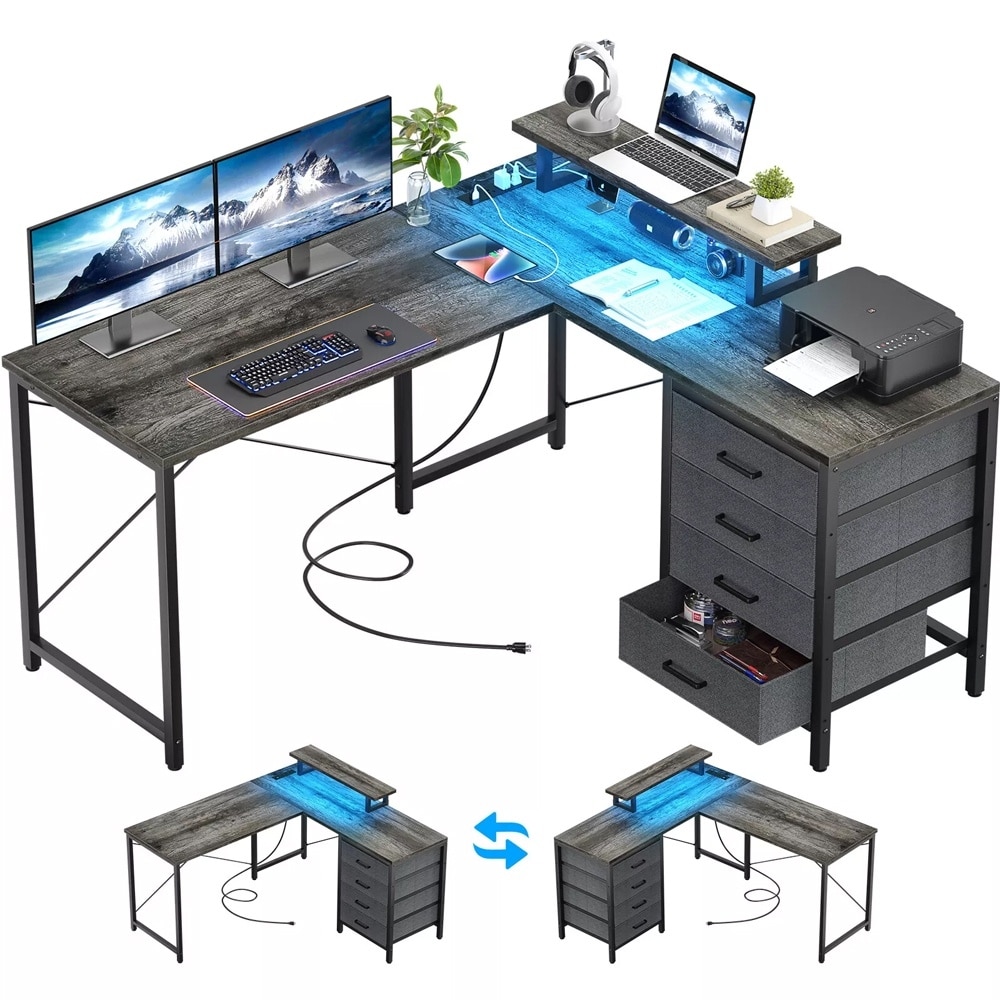 L Shaped Home Office Desk Drawer Computer Desk LED Gaming Desk Gray