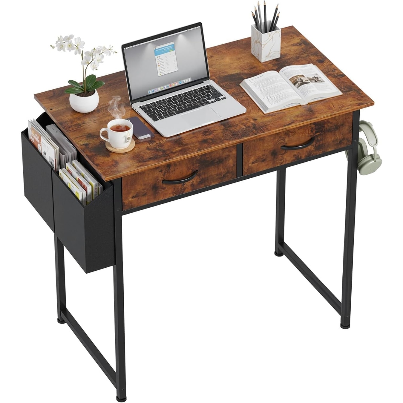 32-Inch Compact Desk with Fabric Drawers and Side Bag for Home Office, Study, or Gaming