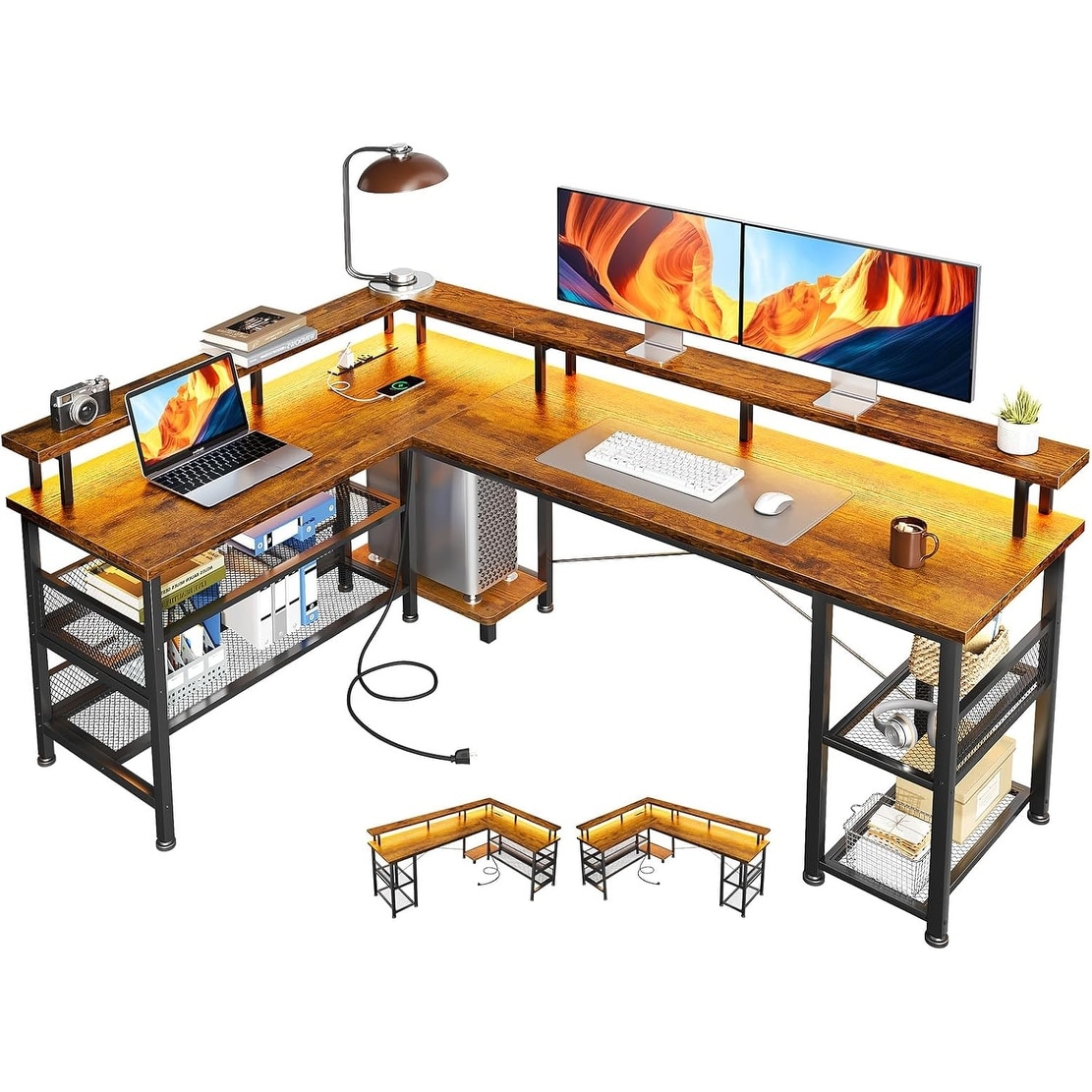 67-Inch Computer Desk with 3 Drawers, Storage Shelves, LED Light, and Reversible Design