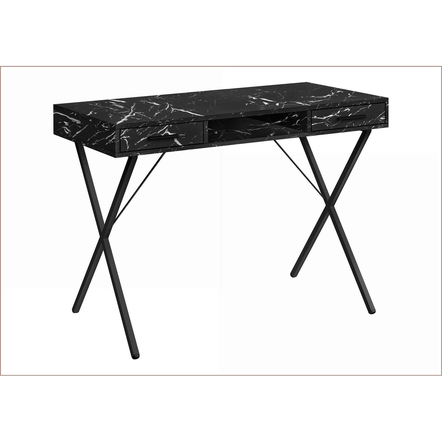 Desks, 42in Modern Computer Desk with Storage, Black Marble-Look Laminate and Metal, Black, Particle Board