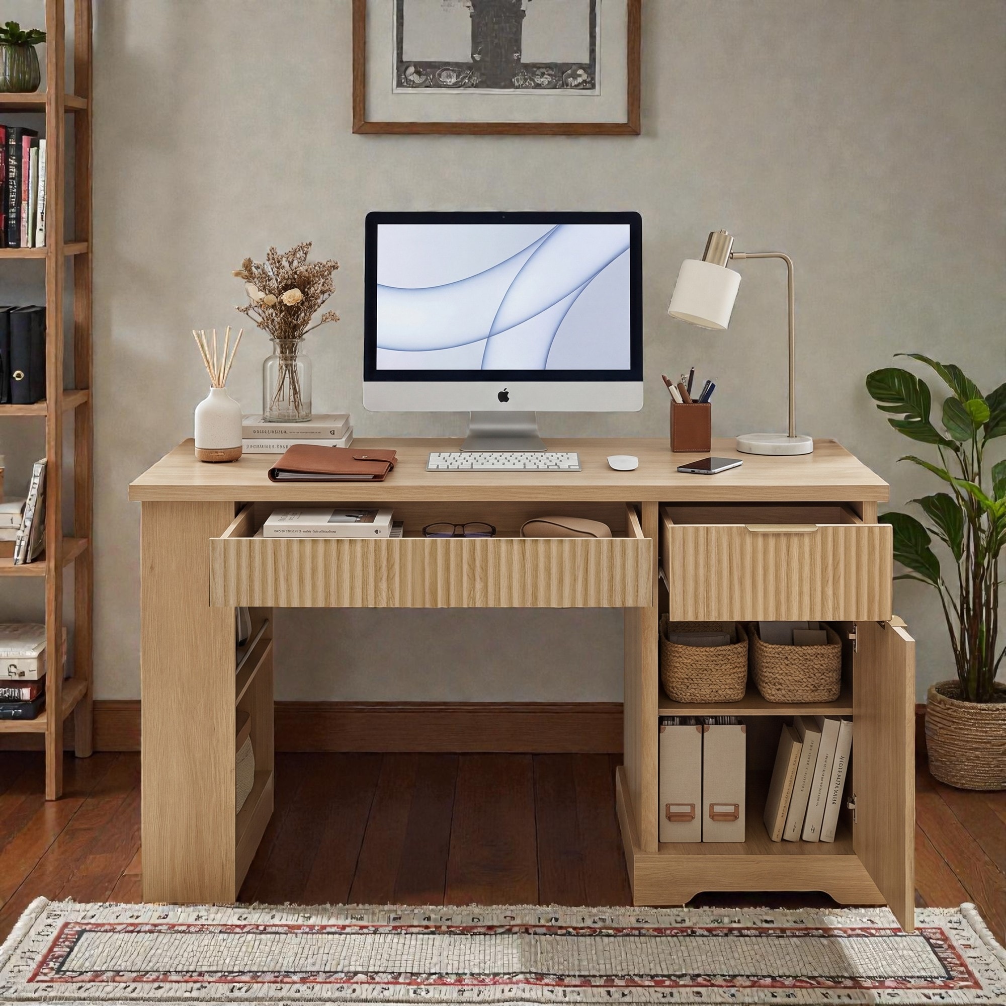 55 Inch Modern Fluted Office Desk with Storage Cabinet and Drawers, Computer Desk with Power Outlet Pegboard